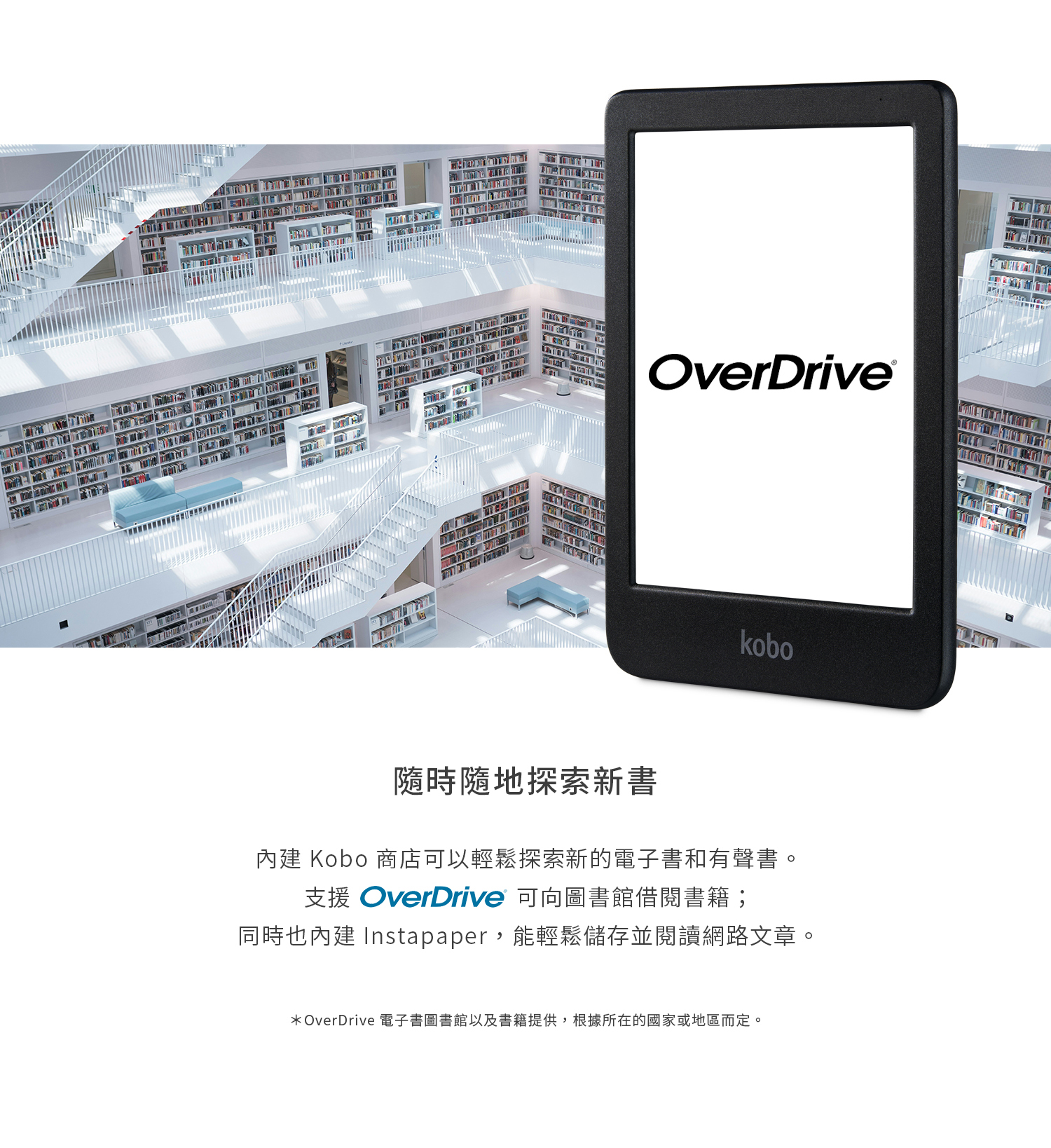 透過內建 Kobo 商店,在您的電子書閱讀器上直接探索新的電子書和有聲書。Kobo Clara BW支援 OverDrive 供您輕鬆向圖書館借閱書籍; 同時也有內建 Pocket,讓您可以儲存並閱讀網路文章。